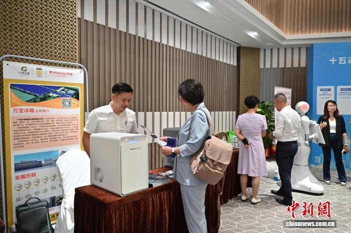 8月20日,十五运会和残特奥会广州赛区科技赋能+超级场景精准对接会在广州(国际)科技成果转化天河基地举行。图为参展商(左)向嘉宾介绍产品。中新社记者 陈楚红 摄