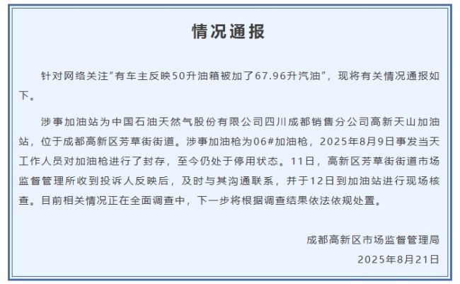 8月11日,高新区芳草街街道市场监督管理所接到投诉后,立即与投诉人取得联系,并于次日前往加油站进行现场核查。目前,相关部门正在全面调查此事,将依据调查结果依法依规处理。