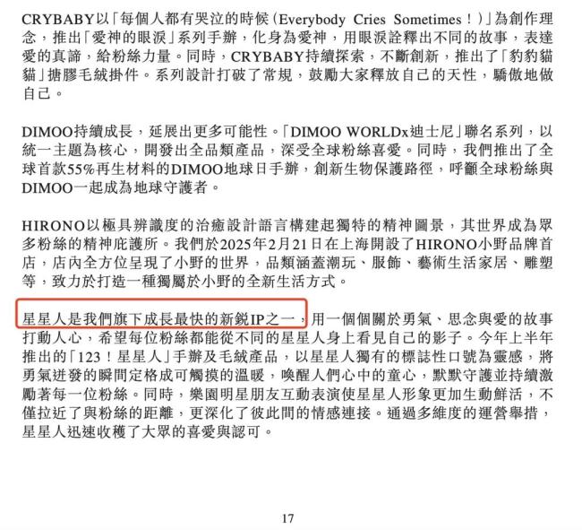 星星人是泡泡玛特2024年签约的IP,在手办、毛绒产品和乐园明星人偶角色的加持下,这一IP迅速走红。半年报中,官方称,星星人为“旗下成长最快的新锐IP之一”。