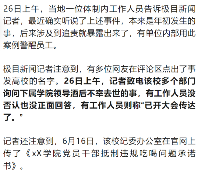 保定一高校干部酒后不幸去世!日前,有网友发文询问保定某高校发生的大事件,据说与饮酒有关。另一篇帖文透露,今年一月,该校下属学院的一名领导在参加宴请后突发疾病不幸去世,参与宴请的相关人员均受到了处分。