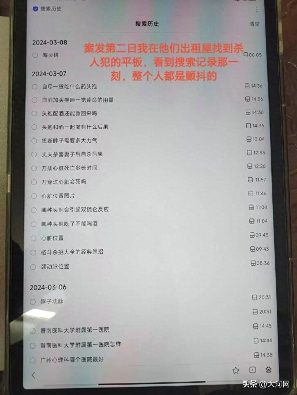 陈某某家属表示,杨某东在作案前,处心积虑地在网上购买了四把刀具,搜索了各种杀人方式以及“丈夫杀害妻子后自杀后果”“精神失常的人犯法需要承担责任吗”等法律问题,作案时有清晰回应他人询问以及逃离现场的行为,根本就是伪装精神病。