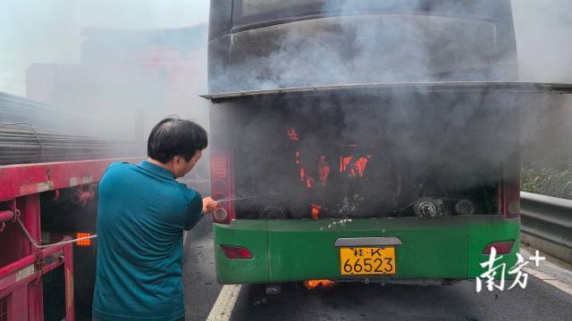 事发时,李建正携女儿返乡探亲。行驶至汕湛高速茂名路段时,他发现前方一辆载有多名乘客的大客车尾部冒出滚滚浓烟,火苗从发动机舱窜出。当时车辆仍在行驶中,司机并未察觉险情。李建立即鸣笛示警,并通过加速超车、闪灯提示等方式引导客车停靠应急车道。