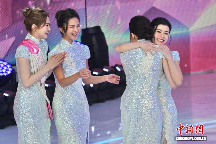 图为2025香港小姐竞选冠军获得者陈咏诗(右一)拥抱亚军获得者施宇琪。中新网记者 李志华 摄