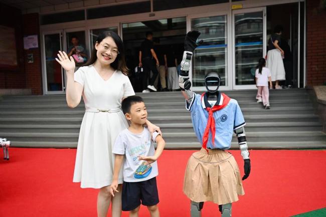 迎新环节中,学校的“科技元素”成为一大亮点。校门口的智能机器狗承担起“向导”职责,通过语音提示和路径引导,帮助新生及家长快速找到对应班级;教学楼大厅内的互动机器人主动与孩子们握手、点头致意,灵活的动作与亲切的互动,让孩子们瞬间拉近与新校园的距离,也展现了学校与时俱进的教育理念。