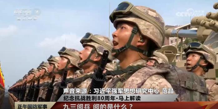 习近平强军思想研究中心 范晶:我们应从时代大趋势、时代大变局、时代大成就的视角,来看待这次阅兵。看似阅的是人和装备,其实阅的是改革重塑、面貌一新的强军风采,是对党忠诚、听党指挥的不变军魂,是薪火相传、熠熠荣光的红色基因,是不怕牺牲、敢打必胜的精神内核,展现的是正义的力量、和平的力量,让党和人民放心的不可战胜的力量。