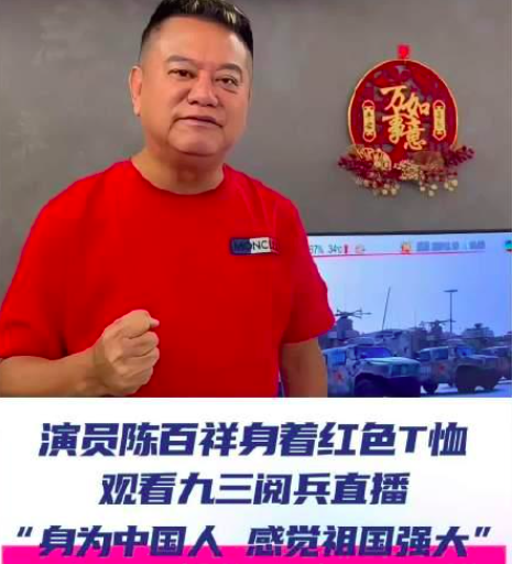 陈百祥身穿红T恤看九三阅兵:身为中国人,感觉祖国强大
