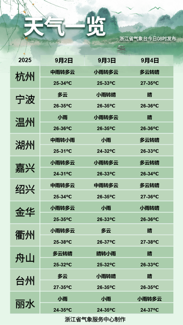 本周天气仍将十分闷热,多地还将再次出现高温天气,需注意防暑降温,高温时段减少户外活动,运动后及时补水,谨防中暑。今天中午到夜里沿海地区晴到多云,午后局部有雷阵雨;其他地区多云,午后到夜里部分阴有阵雨或雷雨,有雷雨地区局部有短时暴雨、个别大暴雨,并可伴有8-11级雷雨大风、强雷电和个别小冰雹。明天全省多云,午后到夜里部分阴有阵雨或雷雨,早晨最低温度为24-26度,白天最高温度浙北北部地区为31-33度,其他地区为34-36度。后天全省晴到多云,午后有分散性雷阵雨。