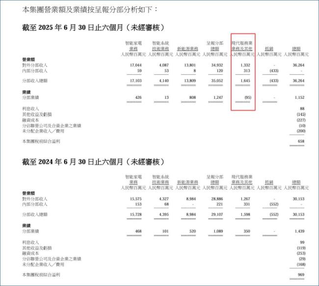 现代服务业及其他业务本期收入13.3亿元,分部业绩(营业利润)却亏损9500万元,成为本期业绩的最大利润缺口,暴露出该业务板块抗风险能力较弱的问题。
