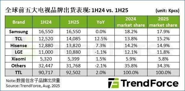 结合多家市场调研机构的数据来看,上半年全球电视出货量在9080万台至9250万台之间,同比下降1.5%或微增2%(由于统计口径不同所致)。虽然数据存在一定差异,但并未影响对市场整体趋势的判断,基于对下半年市场环境的评估,调研机构TrendForce将2025全年电视出货量预估调整为1.95亿台,同比减少1.1%。