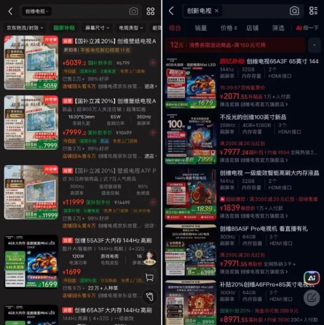 从市场层面来看,消费者对其的营销策略并不买单。从京东等电商平台的销售数据不难看出创维电视的产品结构困境:中高端机型销量普遍仅2万+,市场接受度有限;而最畅销的机型虽售出9万+,但售价仅1699元,属于典型的低端产品,盈利空间可想而知——这一“高端遇冷、低端走量”的格局,直观反映出其高端产品未能打开市场,销量主力仍集中在低利润的低端机型上。