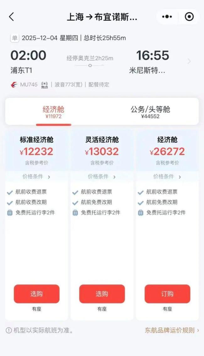 12月5日返程航班信息显示,MU746航班当地时间凌晨2点从布宜诺斯艾利斯起飞,抵达上海为第二天当地时间下午6点,经停奥克兰,飞行时长29小时,经济舱机票12437元起,公务舱45287元起。