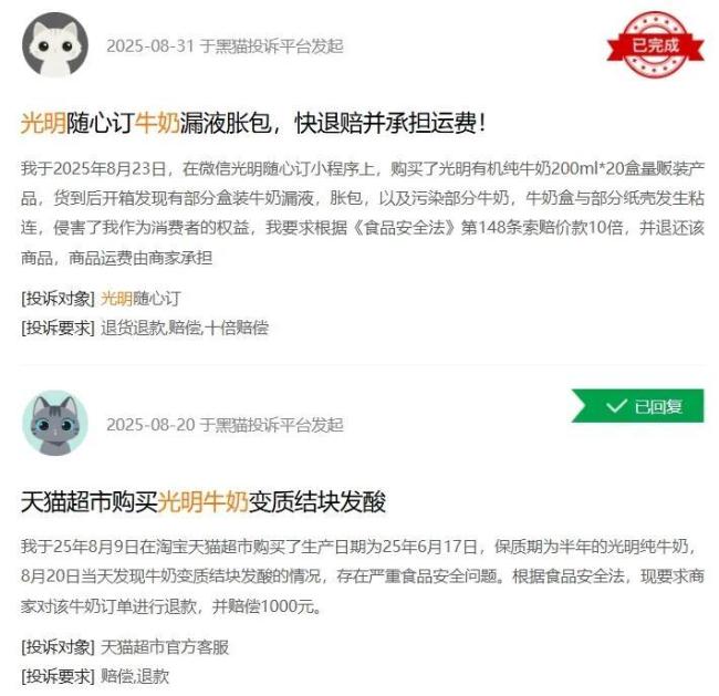 口味是消费者选择奶制品的关键,除此之外,食品安全问题也会影响消费者对品牌的忠诚度。“趣解商业”注意到,“黑猫投诉”平台上有近千条投诉包含搜索词“光明牛奶”,不少消费者投诉内容是有关“牛奶变质”“异味”等食品安全问题。