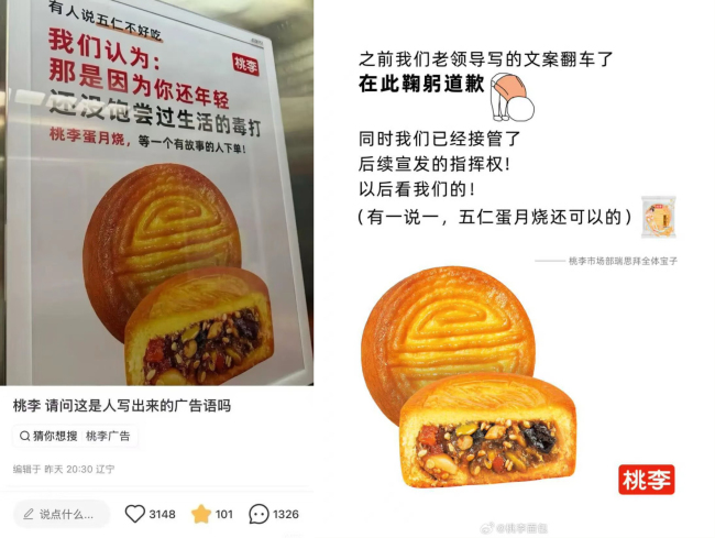 桃李面包在广告文案中写道:“有人说五仁不好吃,我们认为:那是因为你还年轻,还没饱尝过生活的毒打。桃李蛋月烧,等一个有故事的人下单!”