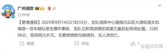 当晚,广州消防发布警情通报称,2025年9月14日21时33分,支队指挥中心接到报警,白云区大源街道太和南路一货车疑似发生爆炸事故。支队立即调派辖区救援力量赶赴现场处置。至22时06分,现场明火被扑灭。主要燃烧物为除锈剂,所幸无人员伤亡。