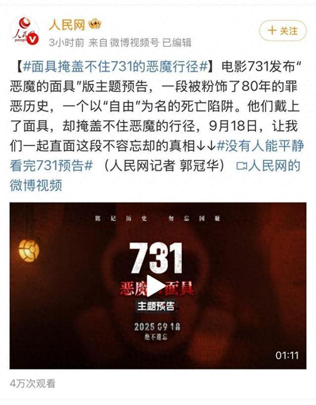 有日本网民呼吁上映731 揭开历史真相!当人民网、央视新闻、新华社这三家国家级媒体共同为电影《731》发声时,这部电影显然不仅仅是一部普通的影片,而是一次对历史真相的庄严捍卫。正当我们期待通过影像揭开历史伤疤时,日本外务省却暗中阻挠,雇佣水军抹黑。他们越是急着掩盖,越证明那些尘封的过往是他们永远不敢面对的罪孽。