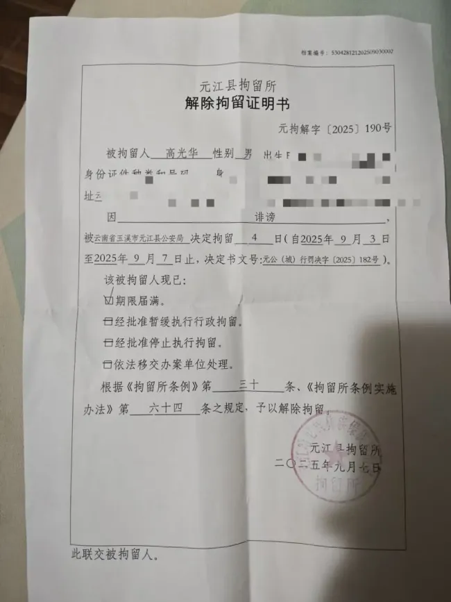 高光华因在微信朋友圈评论县教体局长李文刚被免职一事,被云南玉溪市元江县公安局处以行政拘留四日的处罚。他认为这一决定认定事实不清、证据不足,适用法律错误,违反法定程序,明显不当,将正常的公众监督视为违法犯罪,并于9月17日申请了行政复议。