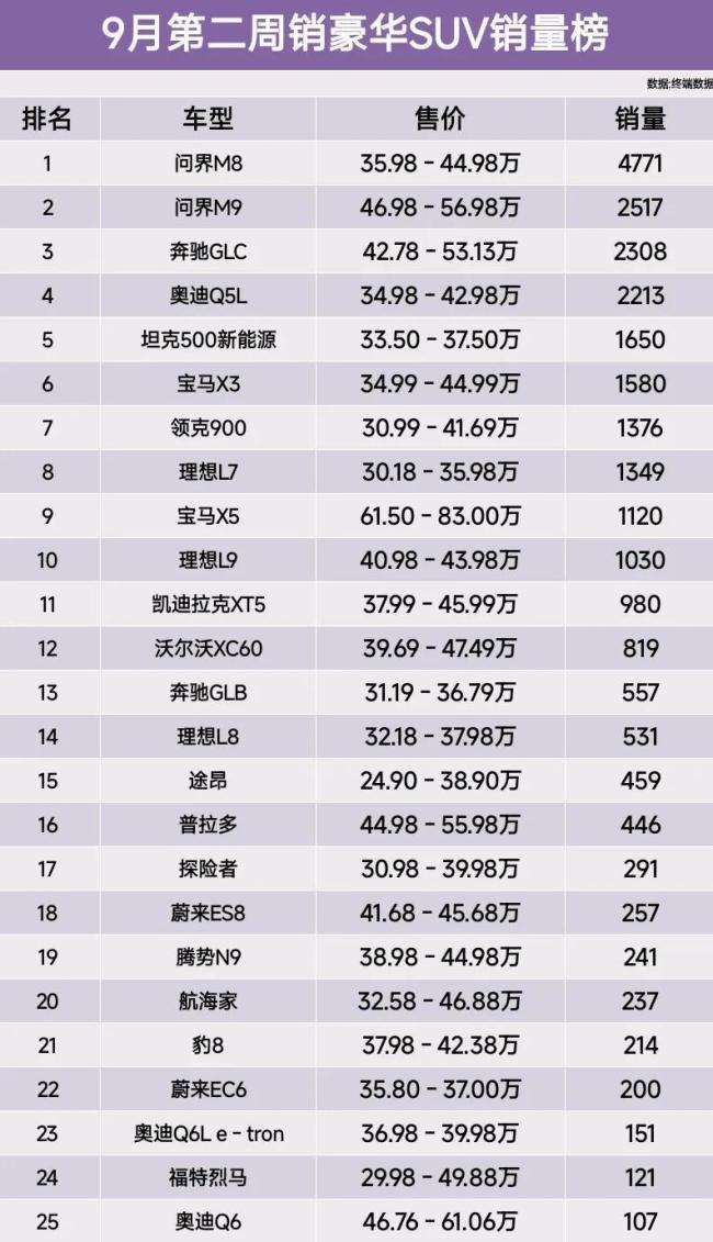 这次榜单中,问界M8和问界M9表现抢眼,分别占据第一和第二名;坦克500新能源排在第五;理想L7排第八;探险者排第十七;腾势N9则排在第十九。这些车型的排名反映了当前豪华SUV市场的竞争格局。