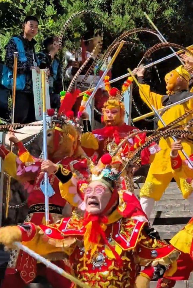 在五龙口景区桃都山,众多“孙悟空”扮演者手持金箍棒,伴随旋律齐舞。经吉尼斯认证官现场确认,成功挑战了“最多人装扮成孙悟空聚会”的世界纪录。