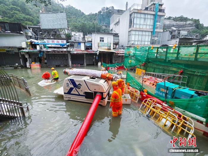 9月24日,今年第18号台风“桦加沙”临近香港,带来狂风骤雨。图为工作人员在鲤鱼门水浸地带进行排水作业。中新社记者 侯宇 摄