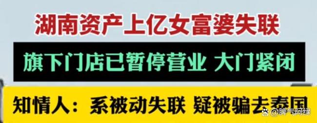 资产上亿女老板失联前称别找自己 背后真相令人震惊。亿万女老板神秘失踪,背后真相让人不寒而栗。就在前几天,湖南长沙一位拥有多家连锁美容院的女老板突然失联了。知情人士透露她可能是被骗去了泰国,而且是被动失联。