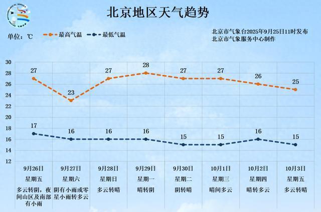 未来一段时间内,北京将受到高空槽影响,26日后半夜至27日白天会有弱降雨过程,提醒市民携带雨具出行,并关注交通安全。未来四至十天内,由于频繁出现弱冷空气活动,天空云量会有所增加,气温也将出现轻微波动,建议密切关注最新的天气预报信息。从9月26日至10月3日期间,白天最高气温将在23~28℃之间波动,夜间最低气温则维持在15~17℃范围内。
