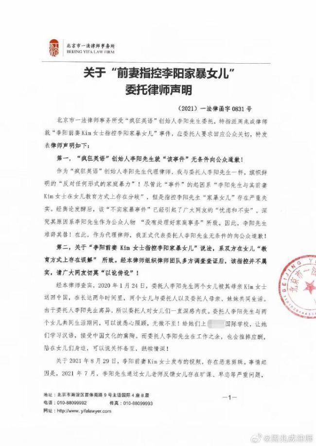 9月28日,李阳“家暴女儿”名誉侵权案代理律师周兆成在社交平台上宣布,李阳在一审中胜诉。作为李阳的代理律师,周兆成表示,在经历了长达三年的网络暴力和恶意诋毁后,李阳终于在这起与前妻指控“家暴女儿”的侵权案件中迎来重大反转。