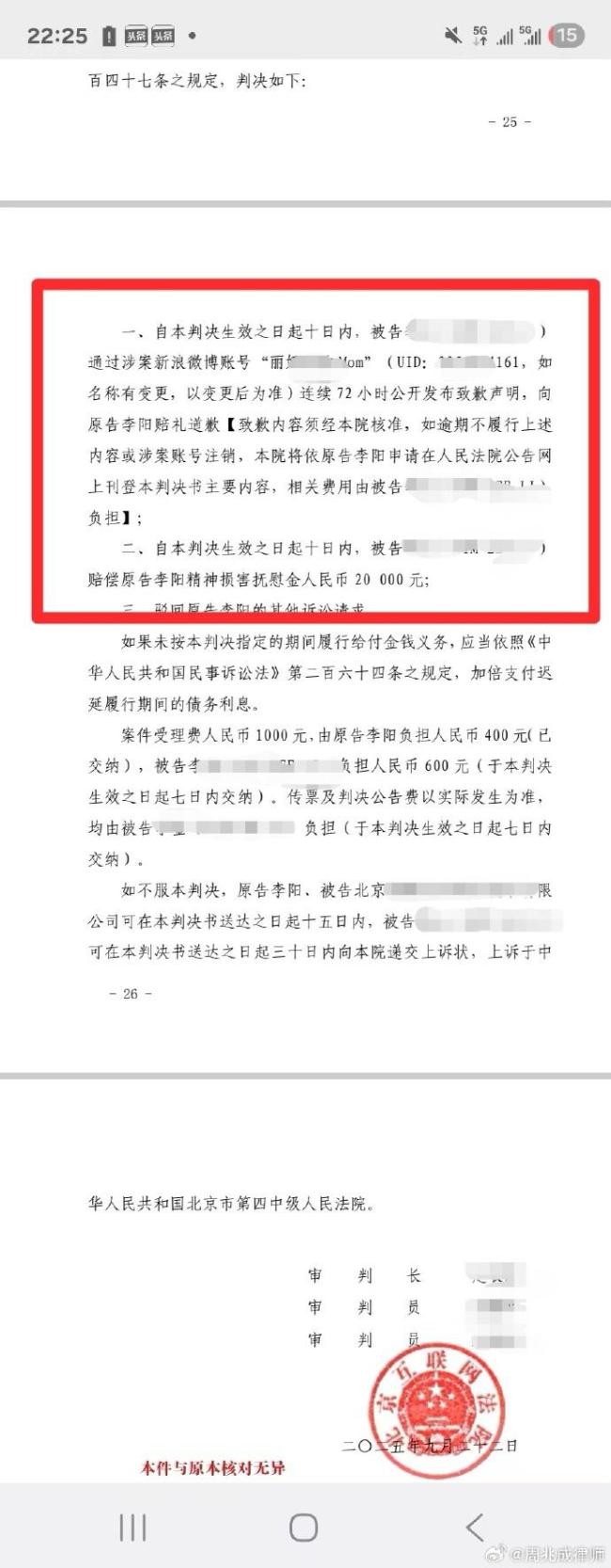 此外,判决要求前妻在涉案账号连续72小时发布《致歉声明》,并对李阳的精神损害进行了实质性的慰藉。虽然精神损害抚慰金数额有限,但这是法律对其精神痛苦的认可,帮助李阳逐步走出舆论阴影。