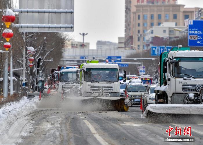 12月11日,一夜降雪后,新疆乌鲁木齐市气温骤降10℃至15℃左右,市政大型清雪车辆及时清扫城市主干道保障交通。受强冷空气影响,12月10日该市出现强降雪及大风天气,气象部门相继发布寒潮和暴雪预警信号。中新社记者 刘新 摄