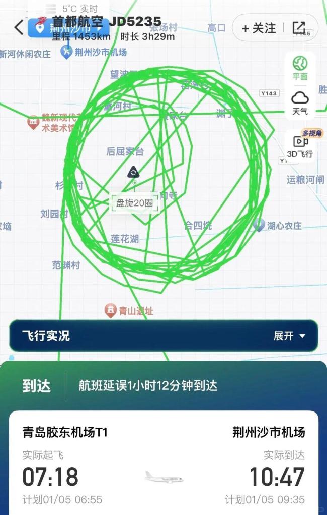 首都航空工作人员解释称,当天JD5235航班从青岛起飞后,在荆州沙市机场附近遭遇大雾天气,导致飞机无法安全降落,因此在空中盘旋等待降落条件改善。