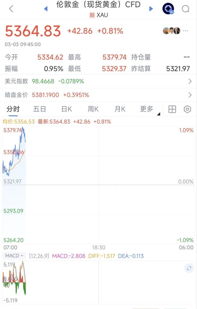 3月3日,现货金银周二高开反弹,截至发稿,现货黄金涨0.81%报5364.83美元/盎司,现货白银反弹,日内涨幅扩大至1.07%左右,报90.27美元/盎司。