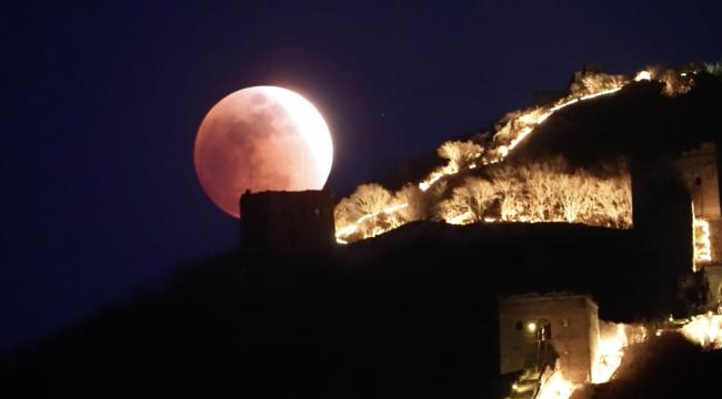 月全食长城同框意境拉满 红月升起震撼美景!3月3日,元宵节与月全食相遇。红月亮从长城上升起的景象令人震撼。通过视频可以感受到这一壮观时刻。愿大家平安幸福,岁岁安康。