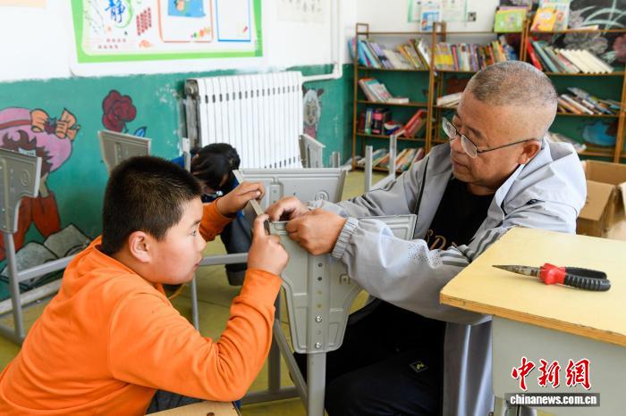 姚建和学生们一起修理桌椅。陈艳秋 摄