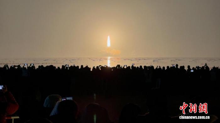 3月22日深夜,山东海阳连理岛,游客近距离观看海上火箭发射。中新社记者 王娇妮 摄