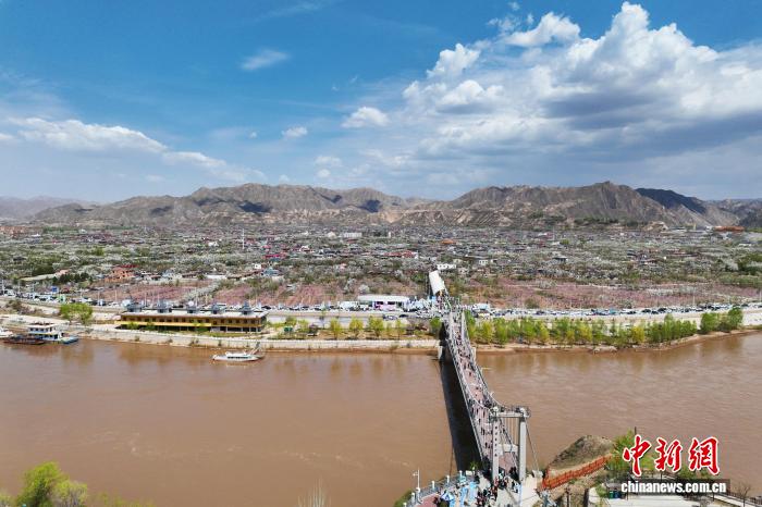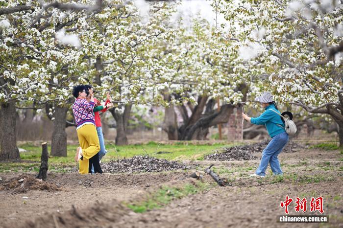 4月12日,位于甘肃省兰州市皋兰县什川古镇的万亩百年古梨园花开吸引游人踏青拍照。中新社记者 李亚龙 摄