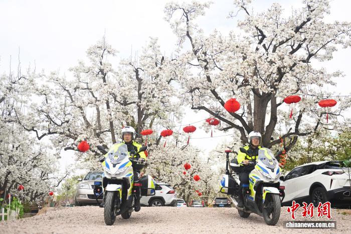 4月12日,位于甘肃省兰州市皋兰县什川古镇的万亩百年古梨园,皋兰县公安局古梨园生态旅游警务站民警为保障游人安全进行巡逻。中新社记者 李亚龙 摄