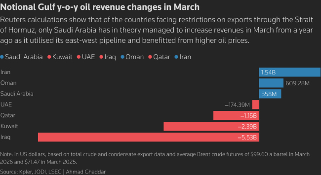 霍尔木兹封锁阴云笼罩,沙特3月石油收入不降反增4.3%,伊朗增加37% 油价上涨抵消出口下降