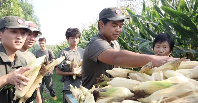 高校军训拉练偶遇农忙大爷 学生帮大爷剥了一车玉米