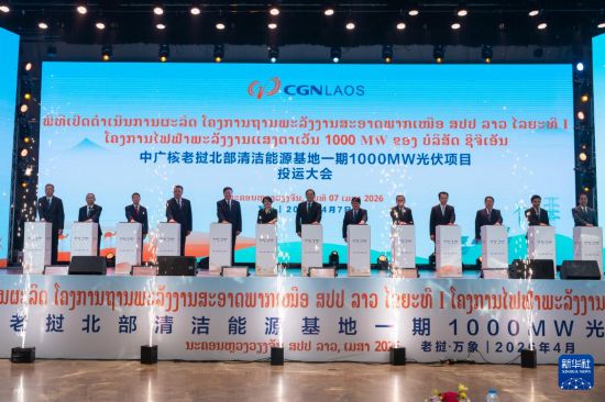 这是4月7日在老挝首都万象拍摄的,中广核老挝北部互联互通清洁能源基地一期100万千瓦光伏项目投运大会现场。新华社发(凯乔摄) 新华社万象4月8日电(记者马淮钊 赵旭)中广核老挝北部互联互通清洁能源基