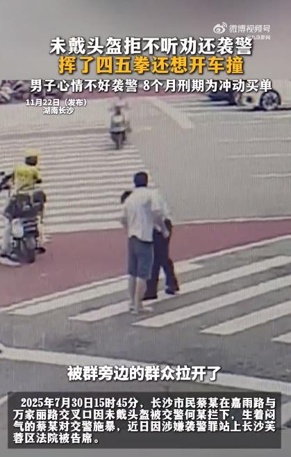 近日,一男子殴打交警的视频引起关注。7月30日,在湖南长沙嘉雨路与万家丽路交叉口,市民蔡某因未戴头盔被交警何某拦下。蔡某情绪激动,对交警施暴,挥了四五拳,并试图开车撞向交警。最终,蔡某因涉嫌袭警罪被长沙芙蓉区法院判处8个月有期徒刑