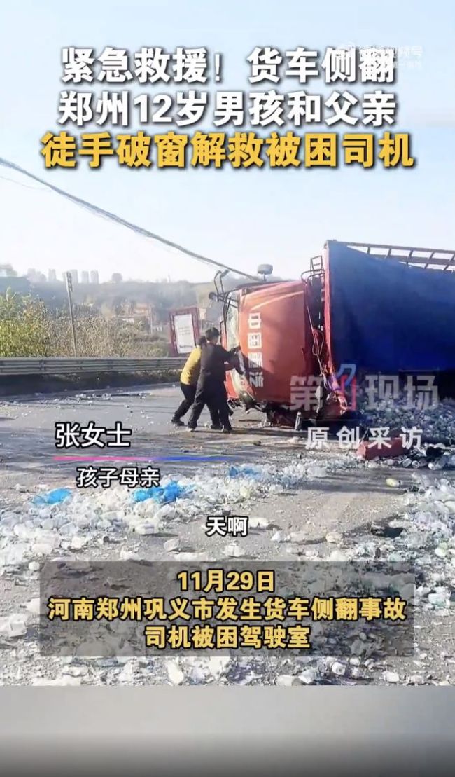 11月29日,河南郑州巩义市发生了一起货车侧翻事故,司机被困在驾驶室内。一位父亲带着12岁的儿子毫不犹豫地冲上前去,徒手掰开玻璃窗施救。司机当时在呼救,父子俩直接冲过去救人,母亲也立即拨打了120急救电话